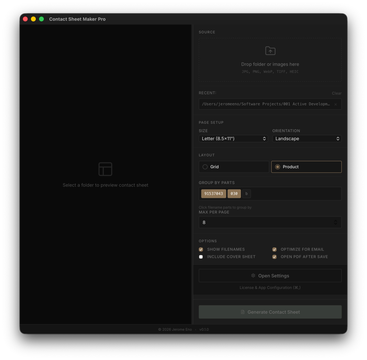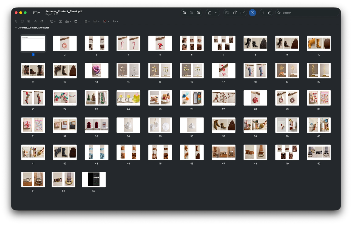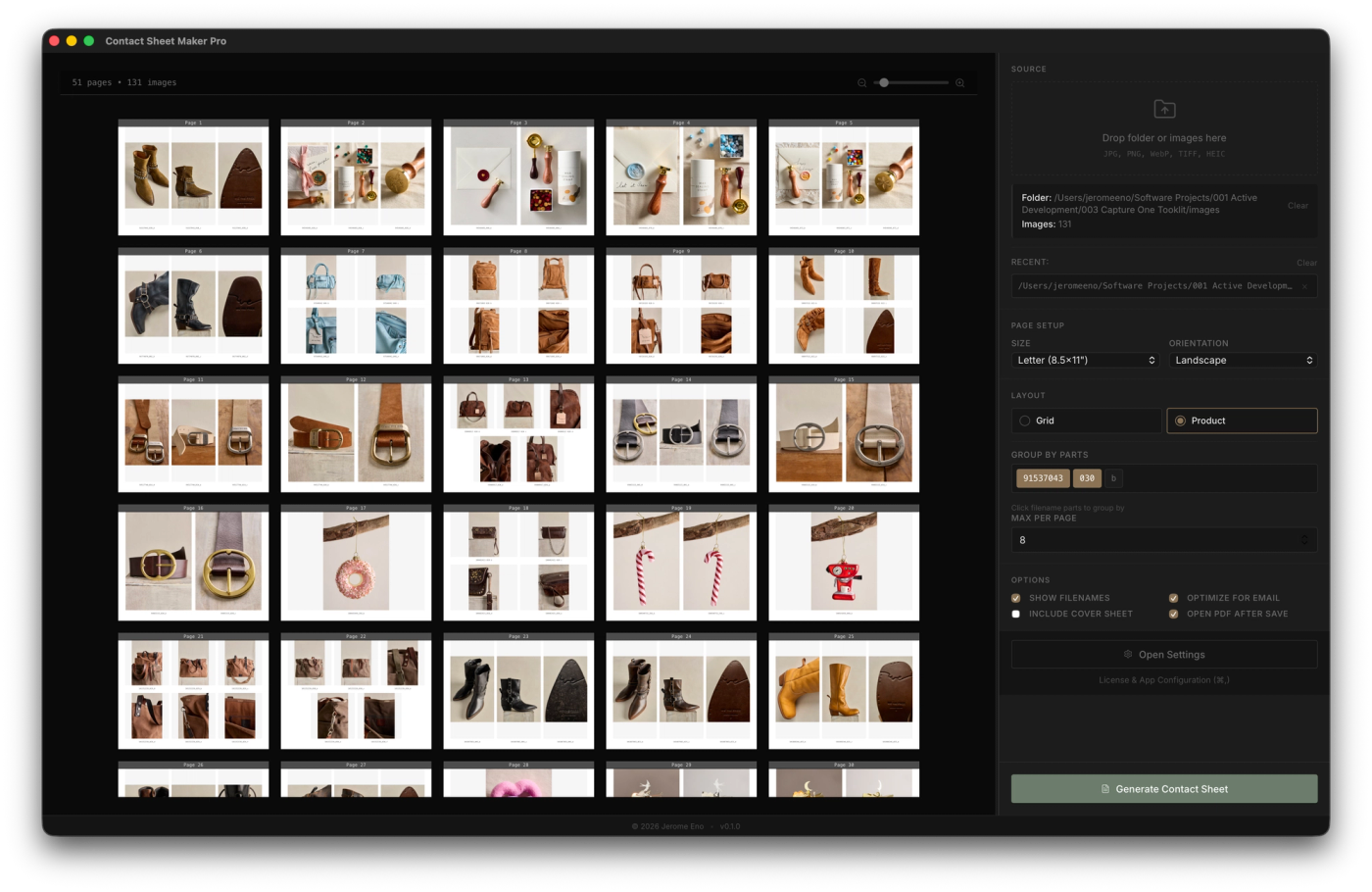 Every other contact sheet maker was built for the photographer who shoots people — where a "page" is just however many frames fit. For product work, a page should mean something. It should map to a SKU, a variant, a style. It should match the way your client thinks about the shoot. That's what this does. Nothing else does.