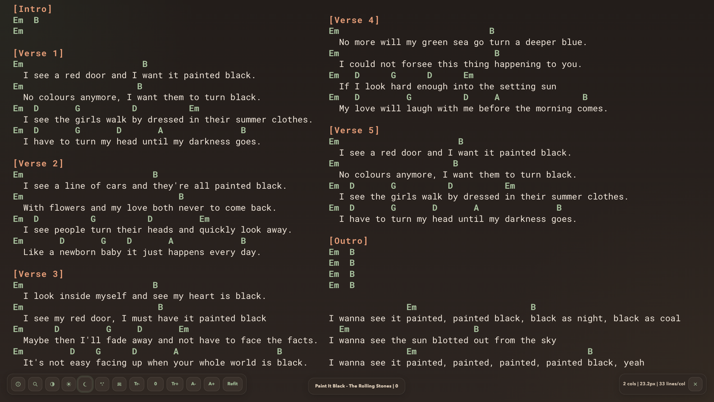 TabPrompter reformats Ultimate Guitar pages into a cleaner teleprompter-style reading view, automatically fitting songs into screen-sized columns.